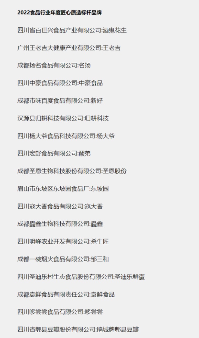 日前,在由第一食品资讯举办,四川创意盒子品牌营销策划有限责任公司承办的2023新增长峰会暨2022食品行业创新百味奖颁奖典礼上,四川省百世兴食品产业有限公司获得“2022年食品行业年度匠心质造标杆品牌”大奖。同时获得该奖项的还有王老吉、郫县豆瓣、圣迪乐等著名企业。